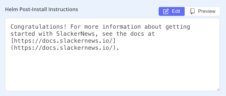 7. Go to the Knowledge base tab. For Helm Post-Install Instructions, enter the following markdown: